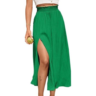 Women Slit Split High Waist Pleated Long Skirt Elastic Flowy Midi Skirt