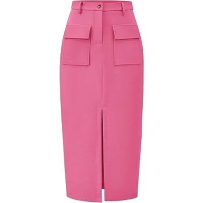 Women High Waisted Cargo Midi Skirt Trendy Summer Fall Pencil Slit Dressy Casual Business Work Skirts with Pockets