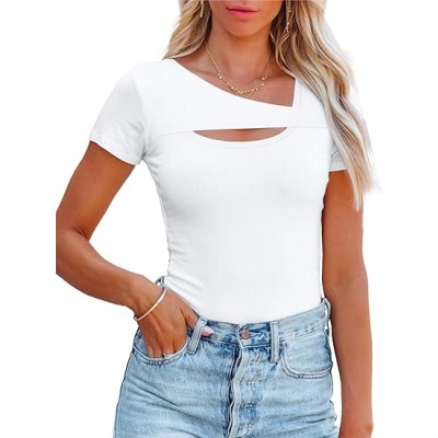Women's Fashion Clothes One Piece Cutout Tops Short Sleeve Ribbed Knit Slim Fitted Shirts Tee Tshirts