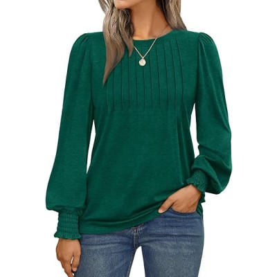 Long Sleeve Shirts Womens Pleated Business Casual Blouses with Smocked Cuffs