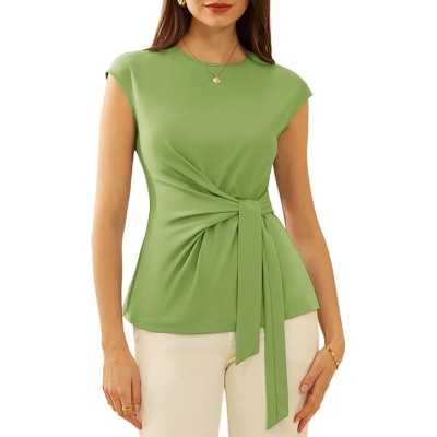 Womens Cap Sleeve Tops Summer Tie Waist Crew Neck Elegant Blouse Dressy Casual Work Business Shirts
