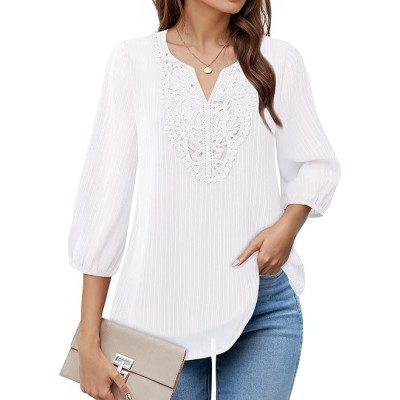 Women's Casual 3/4 Sleeve Chiffon Blouses V Neck Layered Embroidery Tunic Shirts