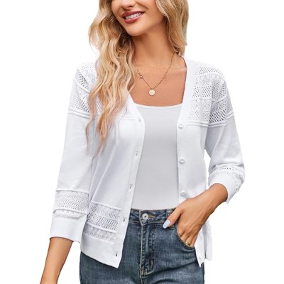 Women's Cropped Cardigan 3/4 Sleeve Lightweight Crochet Shrug Hollowed-Out Knit Sweater Tops