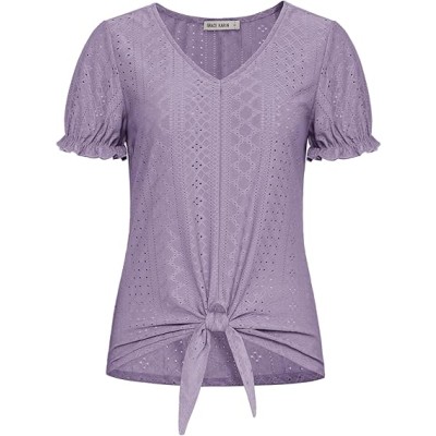 Women's Summer Tops Short Sleeve V Neck Basic T Shirts Dressy Casual Tie Front Tops Eyelet Blouses Tunic