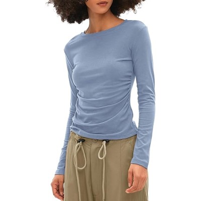 Women's Long Sleeve Crew Neck Shirts Fall Basic Casual Ruched Side Slim Fit T Shirts Tee Tops