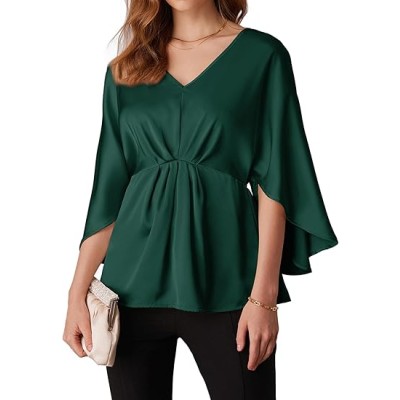 Women's Satin Silk Peplum Top 3/4 Batwing Sleeve Tops for Women Dressy Elgant Blouses Tops