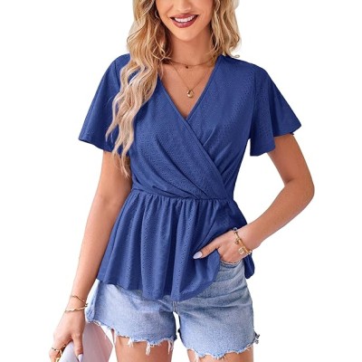 Womens Summer Tops Wrap V Neck Eyelet Top Ruffle Sleeve Peplum Casual T Shirts