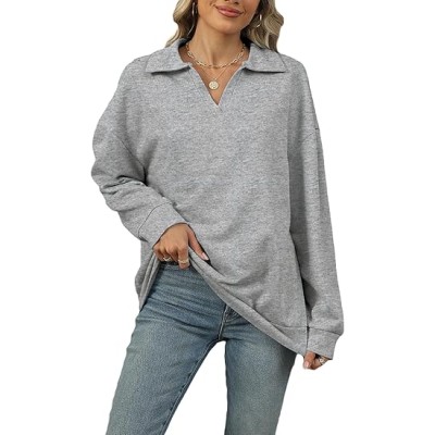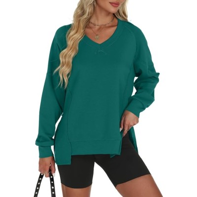 Womens Oversized Sweatshirts V-Neck Trendy Long Sleeve Pullover With Side Slit Zipper Casual Fall Fashion Top