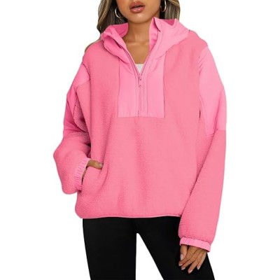 Womens Half Zip Pullover with Pockets Sherpa Hoodie Oversized Hooded Sweatshirt Warm Fleece Jackets
